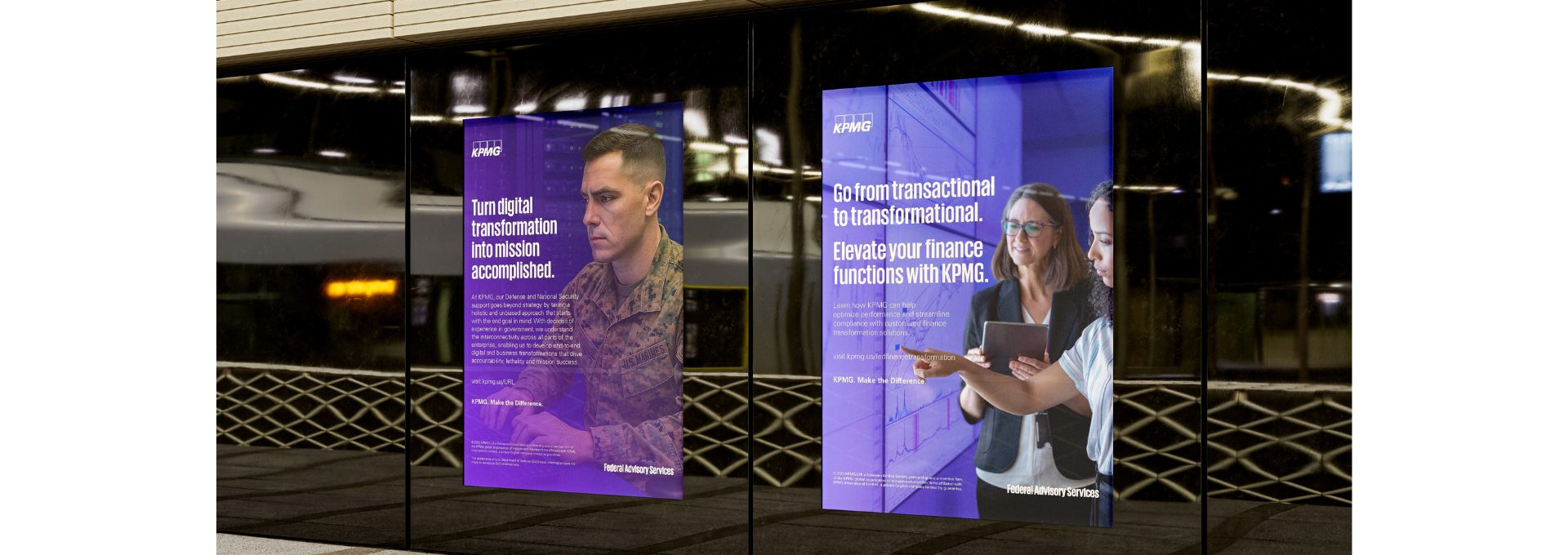 Internally, progress was slowed by complexity. Brand and compliance standards were necessarily rigorous, approvals involved many stakeholders, and marketing teams were operating under tight timelines. Messaging refreshes were difficult to prioritize, and creative work often defaulted to what felt safest. Even practical details – such as sourcing accurate, compliant government and military visuals – proved challenging. Over time, these constraints limited campaign momentum and made it harder to clearly position KPMG as a comprehensive advisory partner.